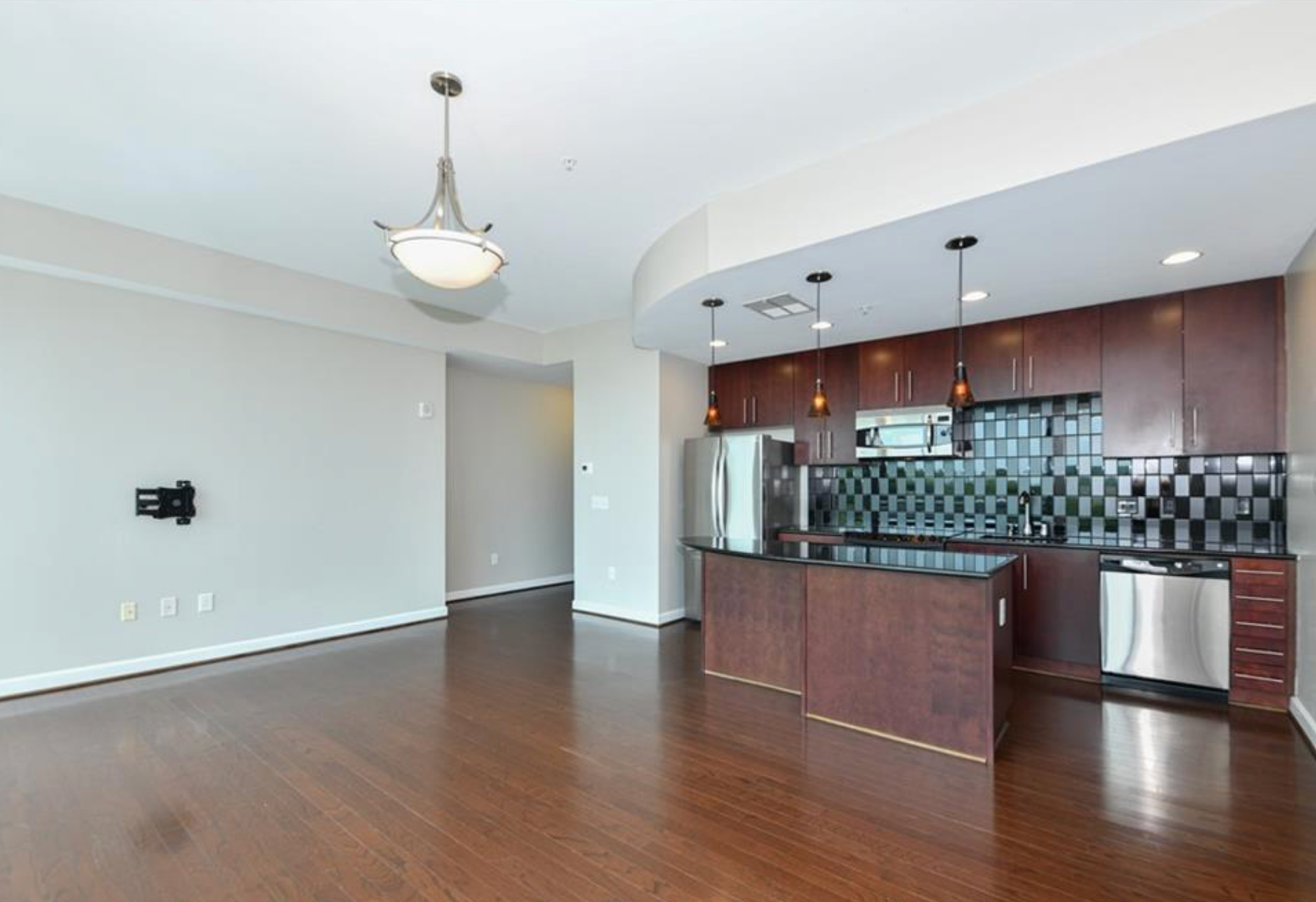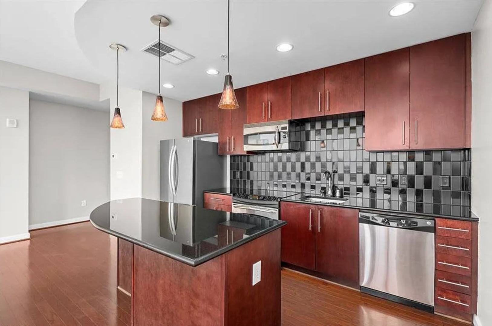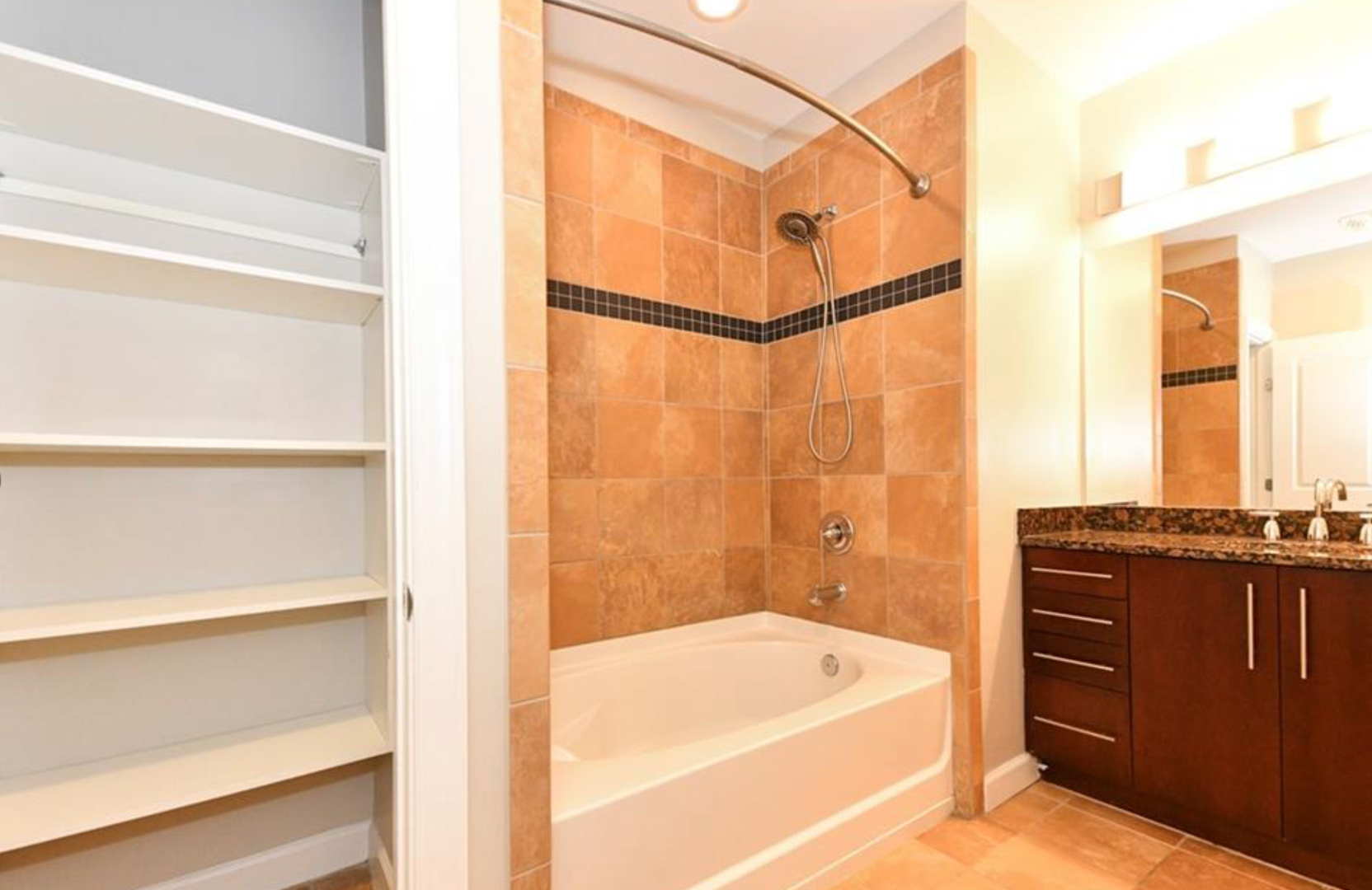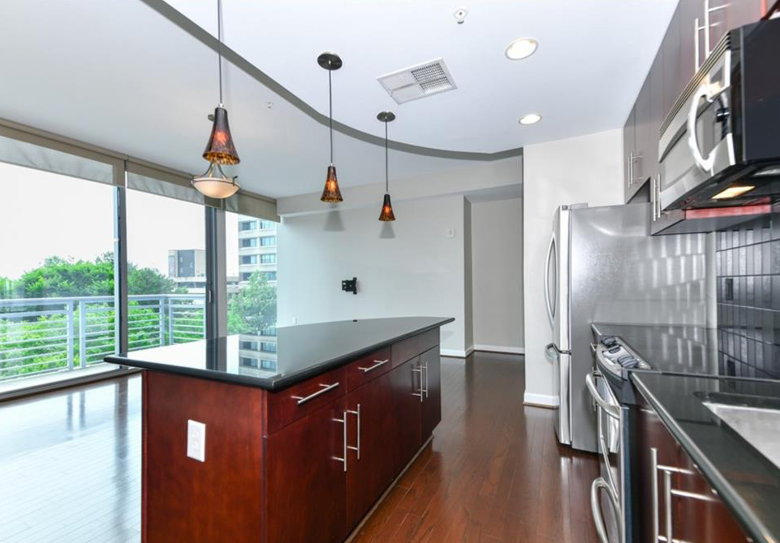 The open kitchen with eat-in island, tile backsplash, and custom cabinetry. Private balcony enjoys beautiful day/night urban views. Primary bedroom is complete with built-in storage and a custom bath with tile work and granite vanity top.