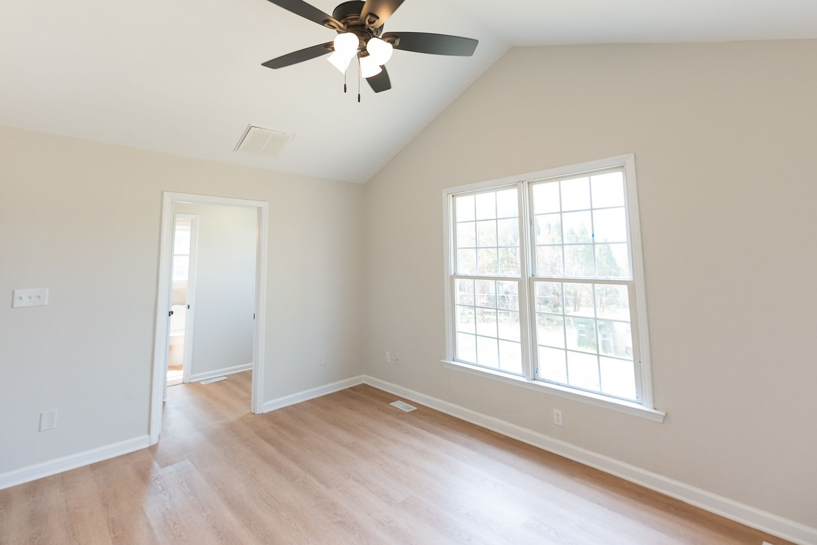 The layout includes a separate, dedicated dining room with vaulted ceilings, distinct from the living area, creating a more defined and functional living space. The primary bedroom features a private ensuite bathroom.