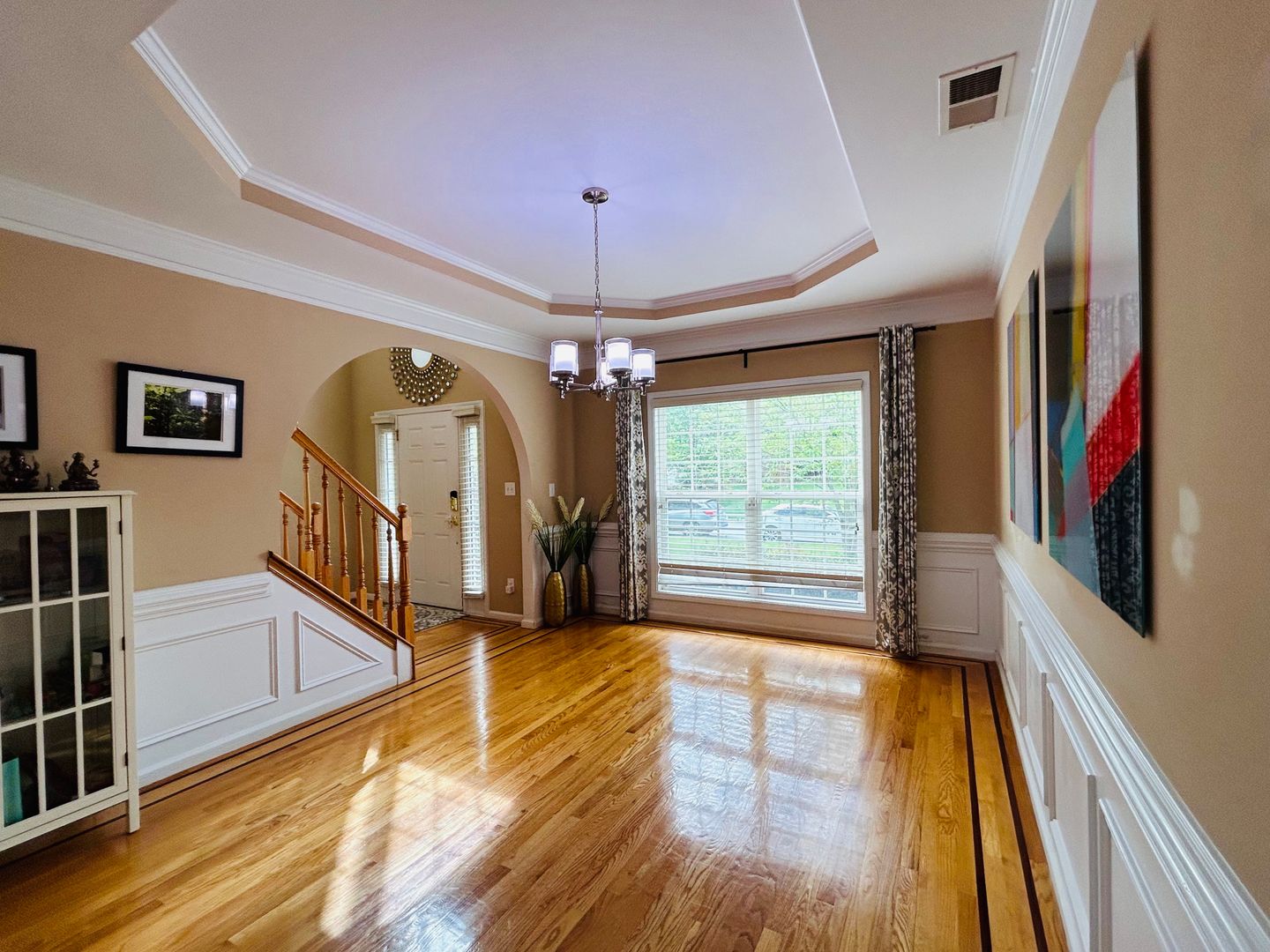 Main level has vaulted ceiling in foyer/spacious living room. 2 offices, formal dining room with tray ceilings. Gorgeous granite/stainless kitchen is open to huge family room. Double french doors from the breakfast room lead to the deck for al fresco dining and outdoor living in the very private fenced backyard
