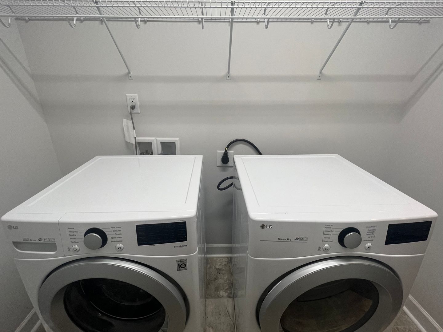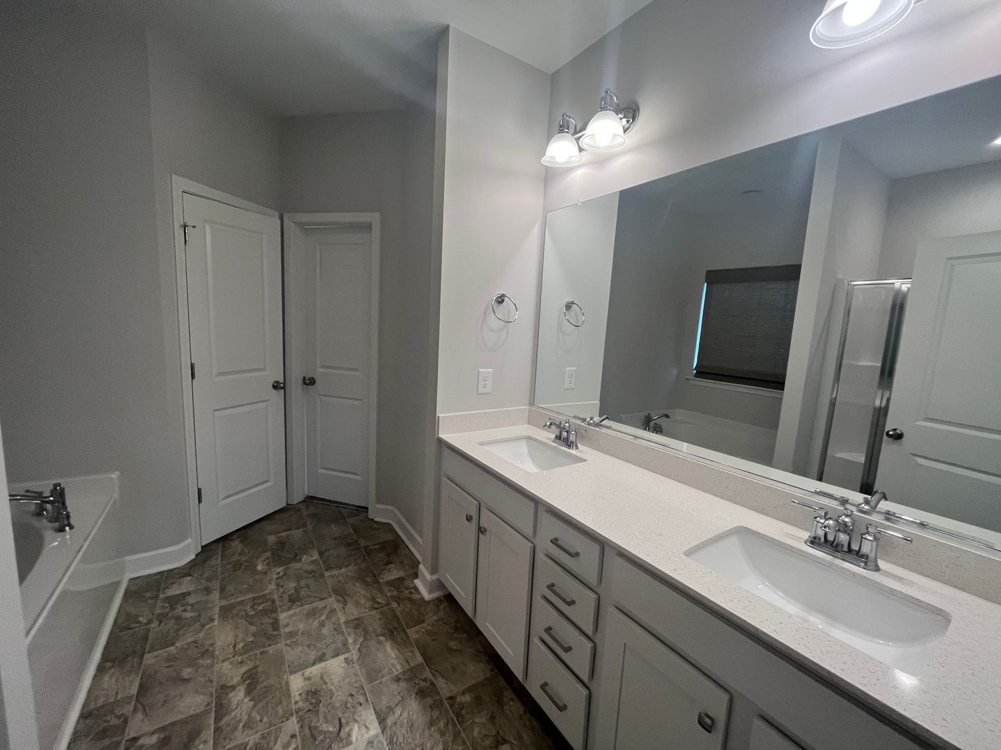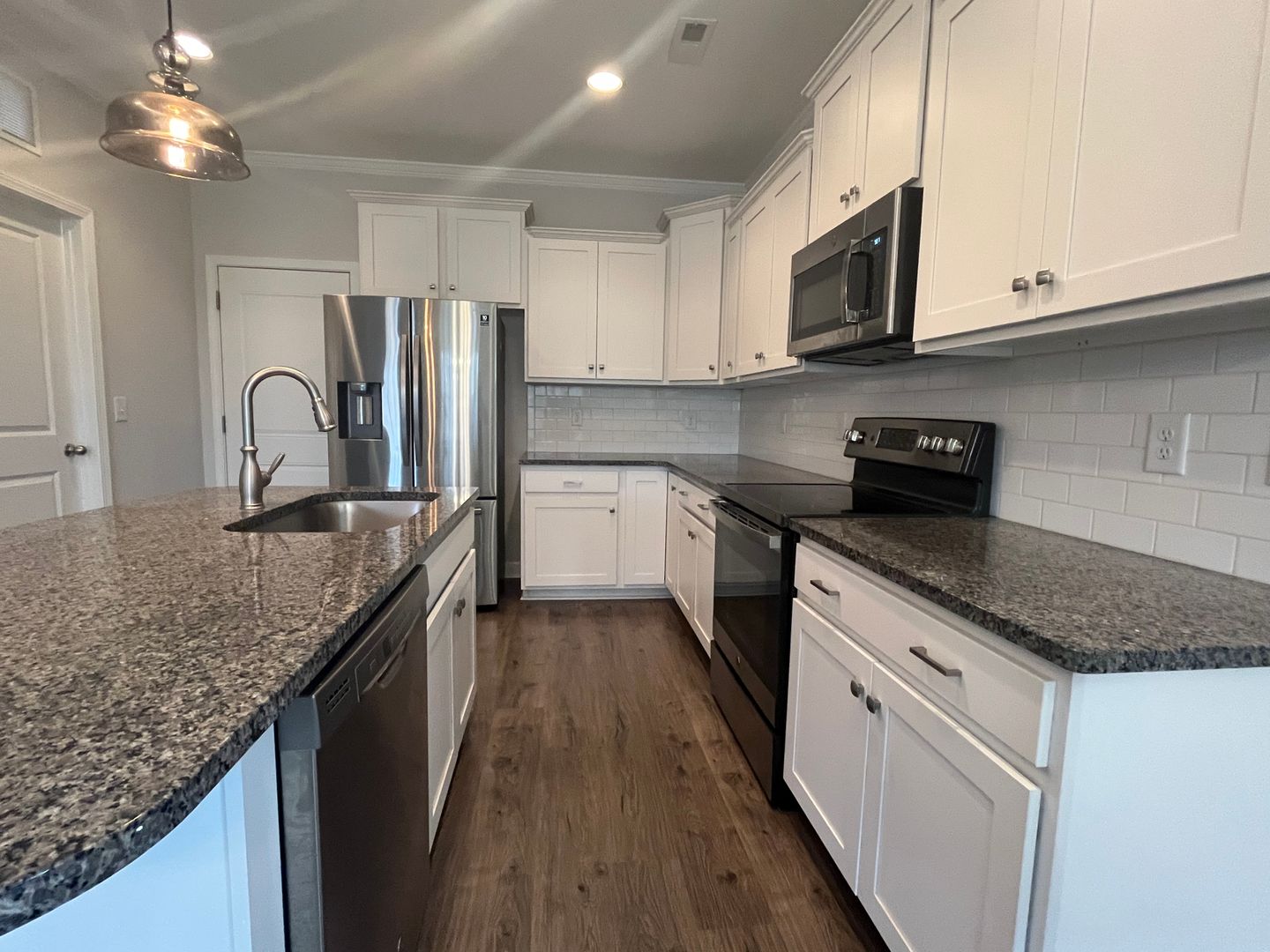 Beautiful open-concept home featuring wood floors throughout the main living area and an open-concept layout. The kitchen is well-appointed with stainless steel appliances, granite countertops, and a large island. The primary suite, conveniently located on the main, includes a dual vanity, soaking garden tub, separate shower, and a generously sized closet with storage shelves. A large laundry room comes equipped with a washer and dryer. Enjoy the covered back patio with an outdoor fan, overlooking a large backyard.